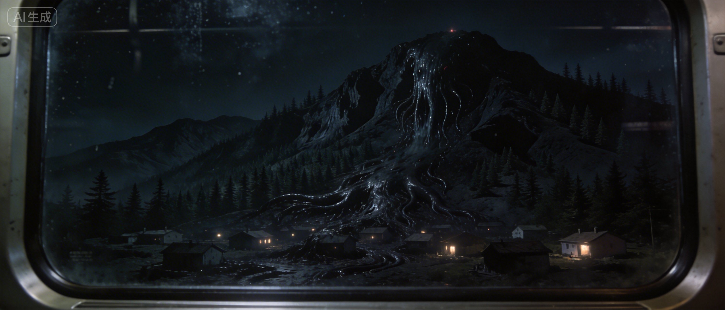 今天夜空没有星星,列车也逐渐从白日的喧嚣转为沉寂,只剩我还有对面的乘客醒着对着车窗发呆。火车驶出隧道,透过窗外,低矮的住宅错落有序地平铺在地表,些许灯火暂未熄灭,远方的黑山在视野里从左至右绵延,遮挡了地平线,划分了天空和大地。“今晚不太平静啊”,对面的乘客喃喃道。“为何?”,我问到。“黑山巨狼快苏醒了,这趟火车装载了大炮,就是为了它而来的”,对面说完不再言语,望向窗外,我若有所思地看着黑山,等待着。随着住宅中最后一点灯光断开,黑山霎时间开始振动,不响但很沉闷。我相信那不是什么巨狼,什么“狼”能撼动整个山脉,以至于山的形态都开始有些许变化?我看见山上好像有粘稠的凝结黑色岩浆往下流淌,四面八方吞噬整个黑山,蔓延至山脚的住宅。“真黑啊”,夜空下看不清,但我却可以肯定那是浓厚如琥珀般的黑。山体的扭曲已经开始侵入到夜空,兴许这块地方很快就要沉入黑暗了,但显然这辆列车不会允许。火炮齐射,高天中弹药迸裂出划破天穹的巨响,可是没有任何火光。一时间什么声音都消亡了,黑山恢复了平静,我现在甚至可以看到黑山表面覆盖的那些松树,密密麻麻伫在山体,亘古不变。那些究竟是什么?我想这个答案再也无人知晓了,因为列车很快驶进了隧道,等再出来时,那片黑山,黑山脚下的住宅,那片黑夜均已不见踪影,仿佛从未存在过。